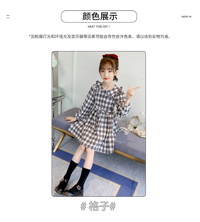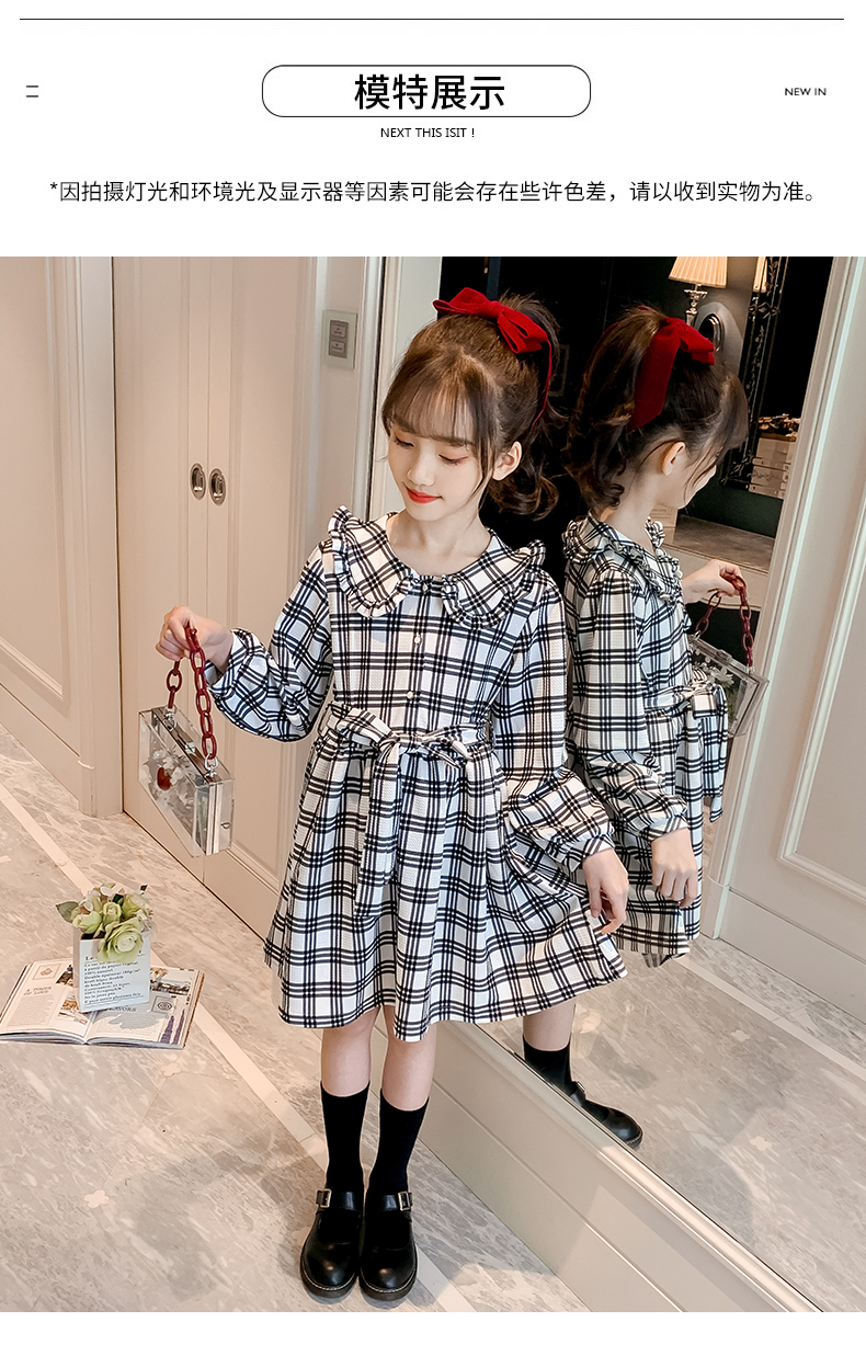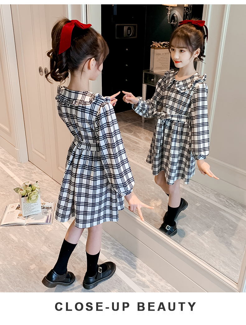 浪莎韓版女童花邊翻領(lǐng)黑白格子連衣裙2021春裝新款兒童長(zhǎng)袖公主裙
