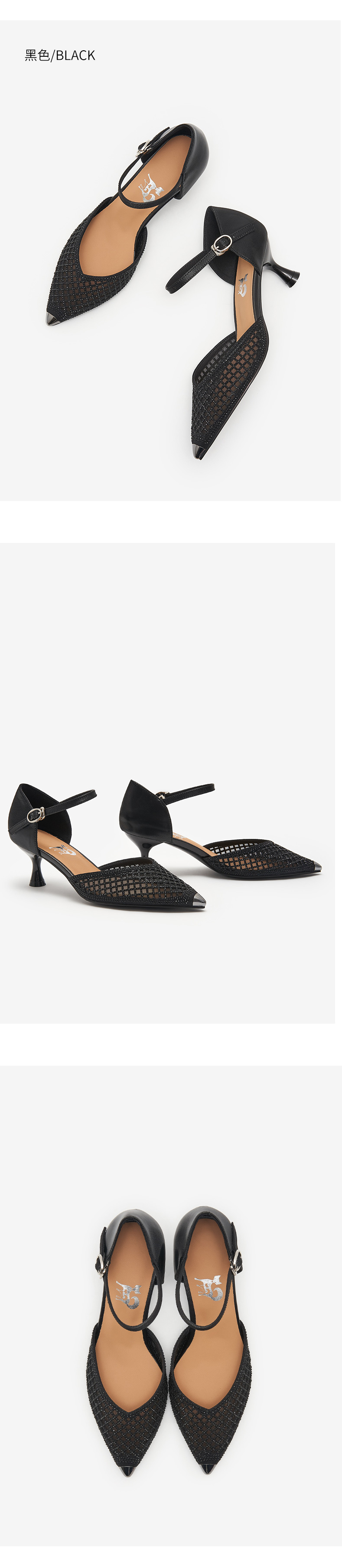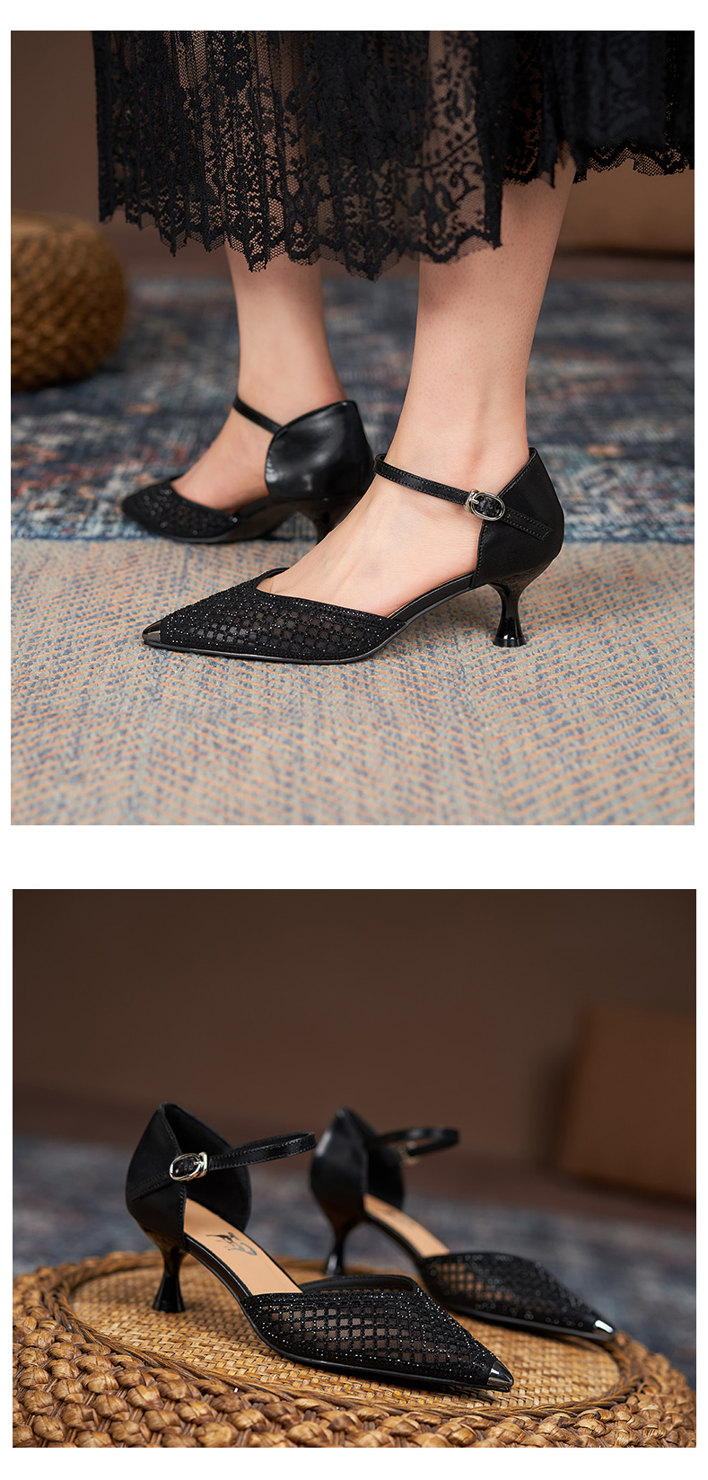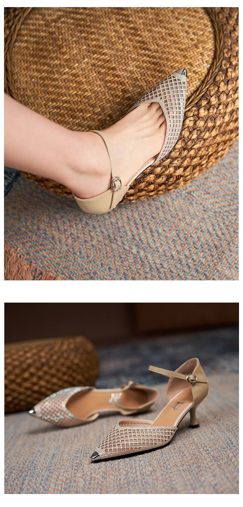細(xì)跟包頭涼鞋女2021年新款夏中跟單鞋帶鉆鏤空網(wǎng)紗一字帶羅馬涼鞋